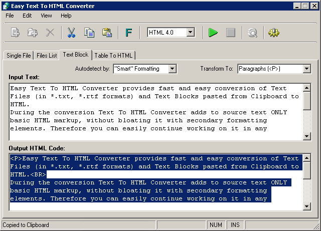 Easy Text To HTML Converter est un outil conçu pour convertir vos fichiers texte (au format *.txt ou *.rtf) ou vos blocs de texte copiés en code HTML ou XHTML de manière intuitive et efficace. L'application se distingue par sa capacité à ajouter uniquement le balisage HTML essentiel, sans surcharger votre contenu avec des éléments de mise en forme superflus. Vous conservez ainsi une base de texte propre, facile à modifier dans n'importe quel éditeur HTML externe.