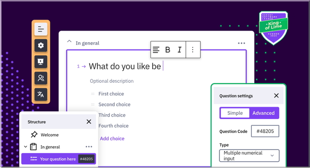 ✔ Plus de 28 types de questions (choix multiples, matrices, textes libres, échelles, etc.).